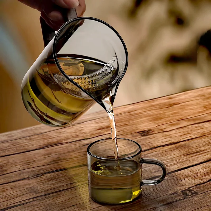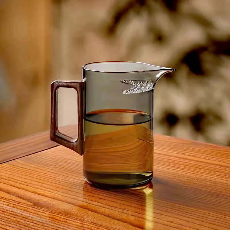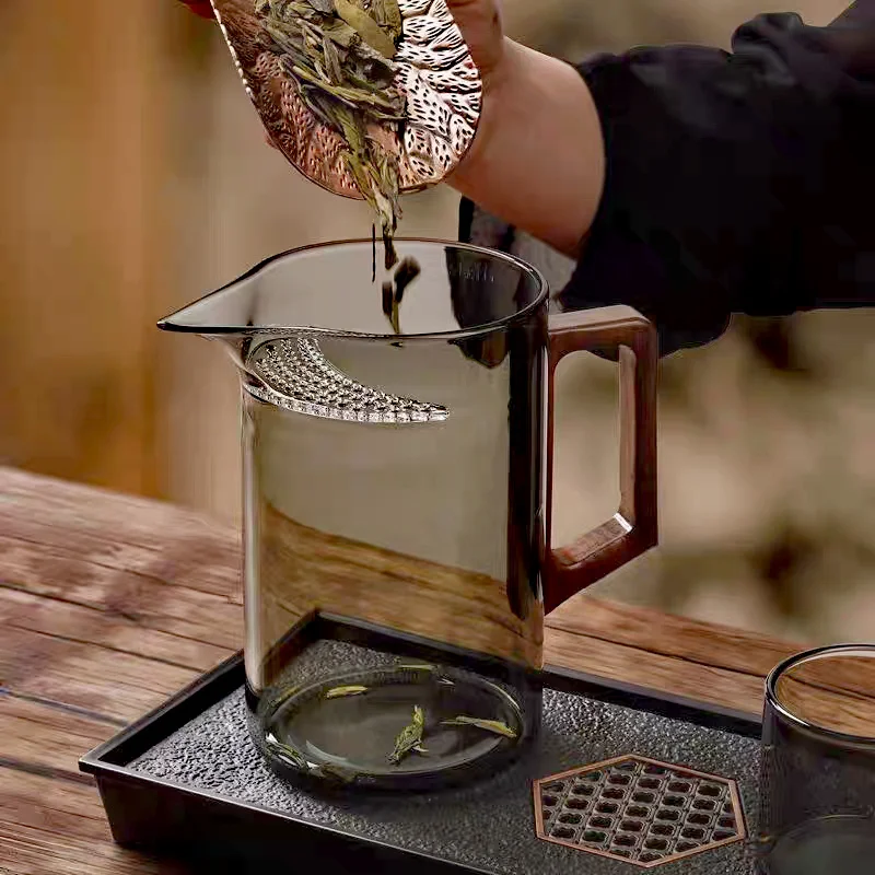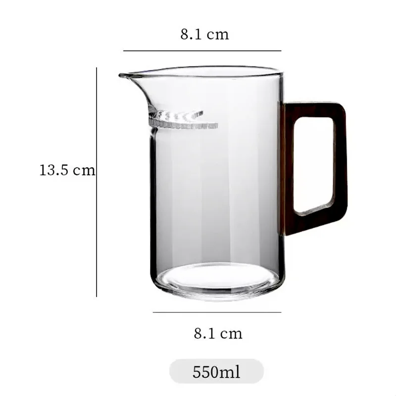 إبريق شاي زجاجي بمقبض خشبي عالي الجودة مع فلتر هلالي، مثالي لتحضير وتوزيع الشاي الصيني التقليدي (كونغفو)، تصميم أنيق للاستخدام المنزلي والهدايا.