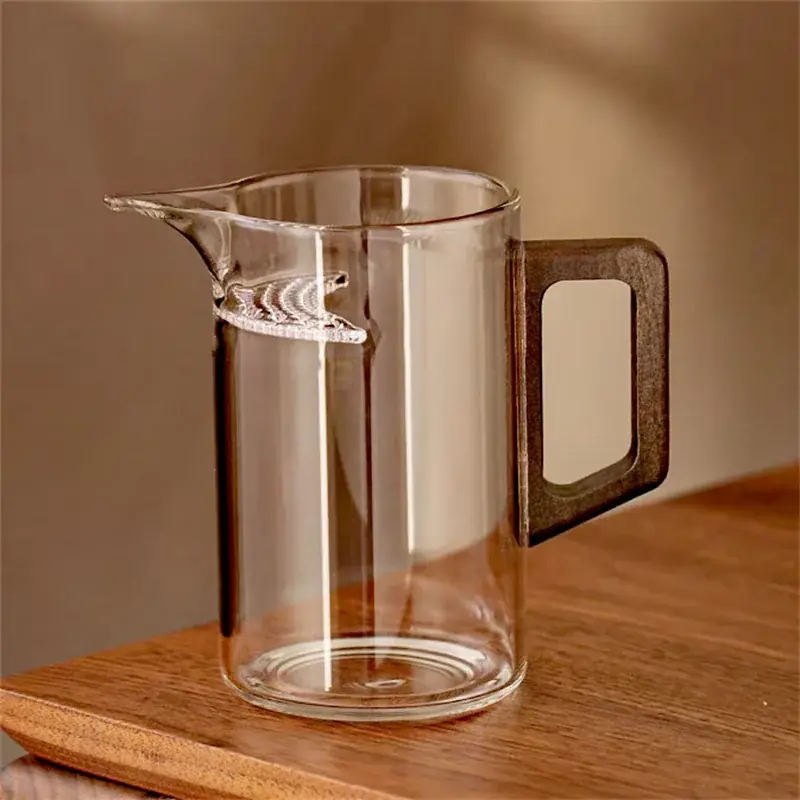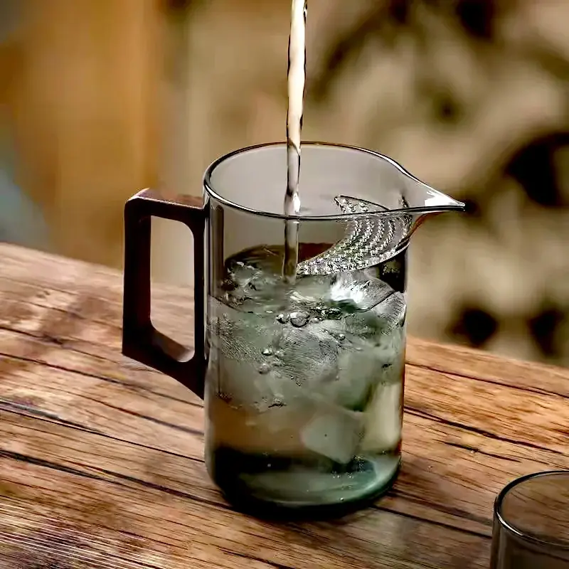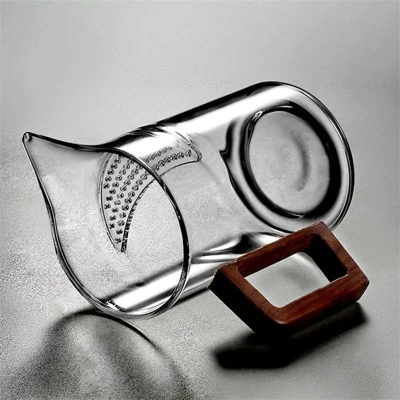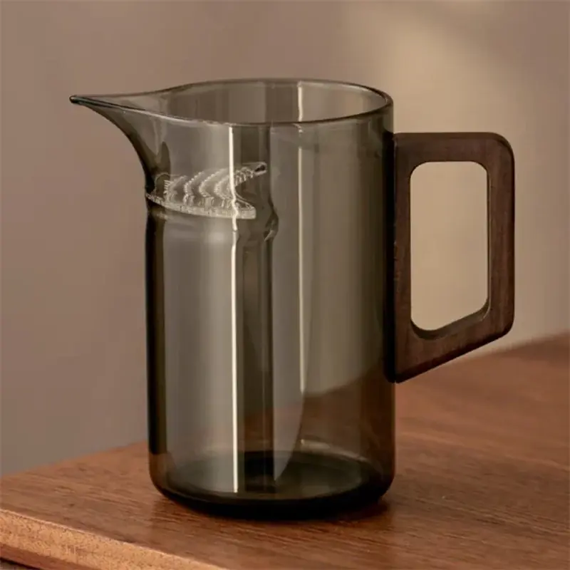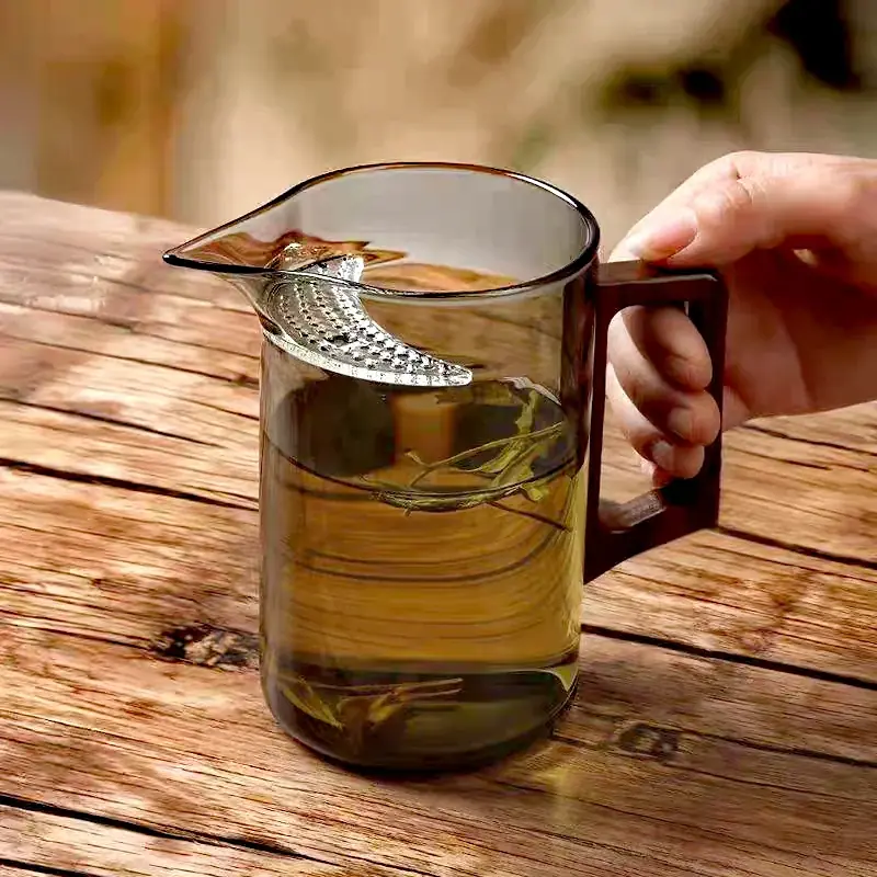 إبريق شاي زجاجي بمقبض خشبي عالي الجودة مع فلتر هلالي، مثالي لتحضير وتوزيع الشاي الصيني التقليدي (كونغفو)، تصميم أنيق للاستخدام المنزلي والهدايا.
