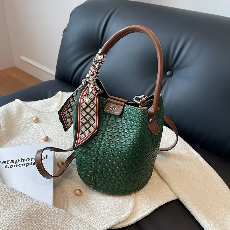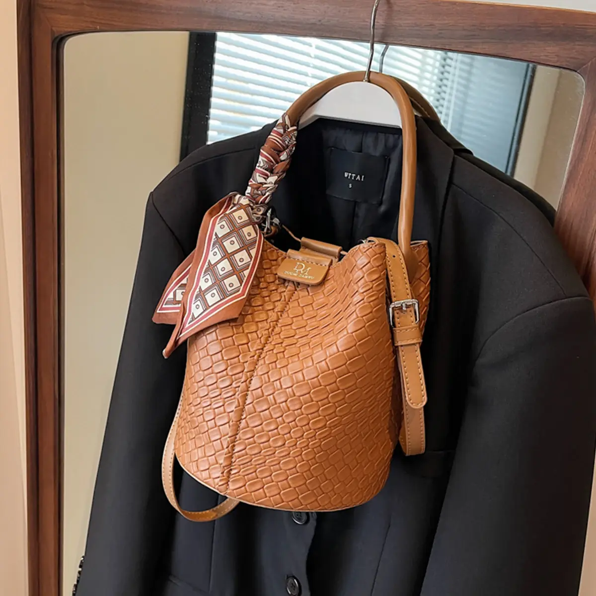 تألقي مع شنطة دلو جلد مجدول أنيقة من سرح، الخيار المثالي للمرأة العصرية.