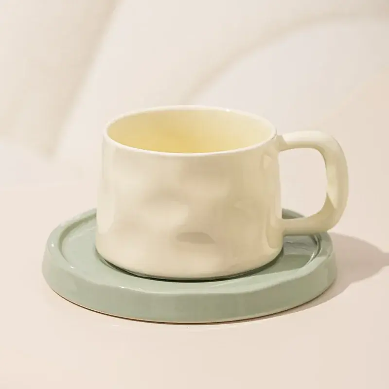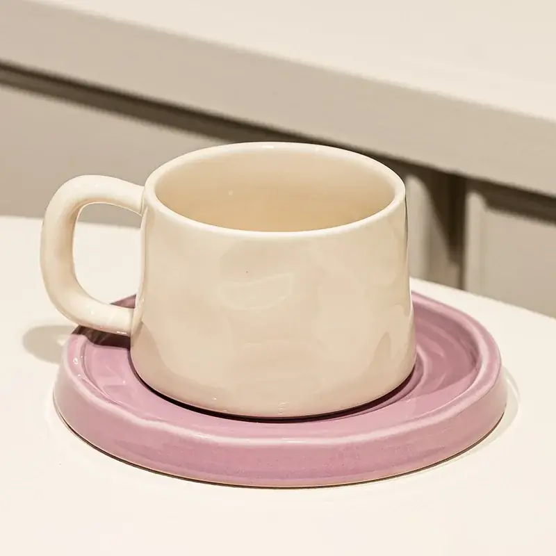 أضف لمسة جمال ونعومة إلى لحظاتك اليومية مع كوب القهوة السيراميك اللطيف مع الصحن من متجر سرح: