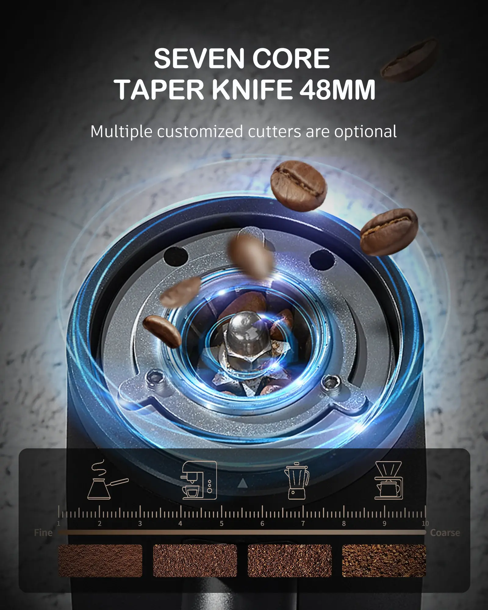ضبط طحن بدون خطوات Stepless: يسمح بتحكم كامل بحجم الطحن لأي طريقة تحضير، من الإسبريسو إلى القهوة المقطرة.