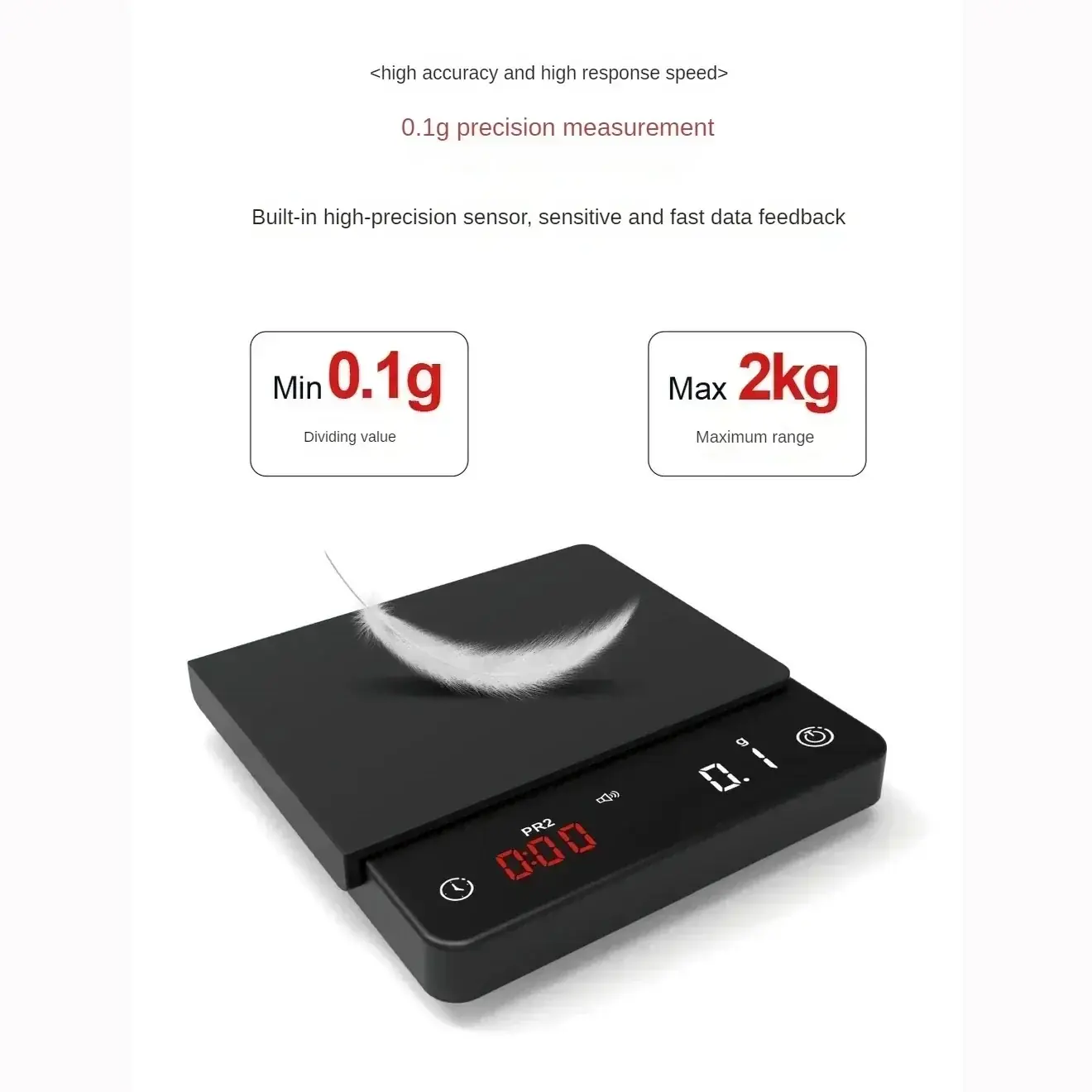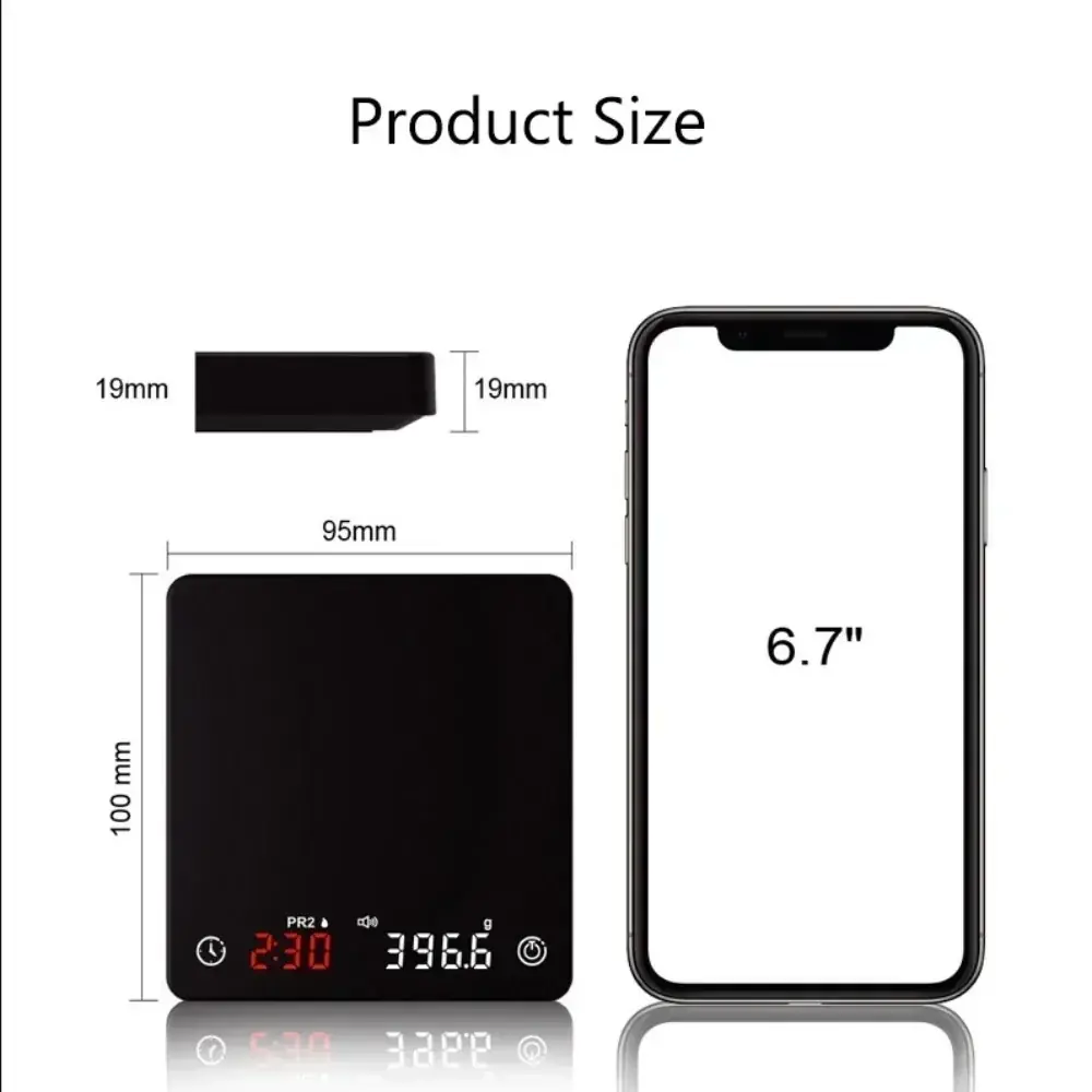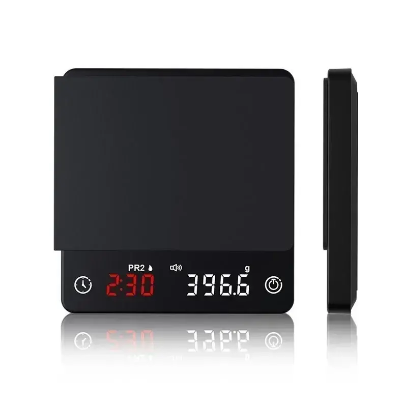 ميزان قهوة رقمي ذكي صغير بسعة 2كجم ودقة 0.1جم، مزود بمؤقت مدمج وشحن USB، مثالي لتحضير الإسبريسو والقهوة المختصة بدقة عالية.