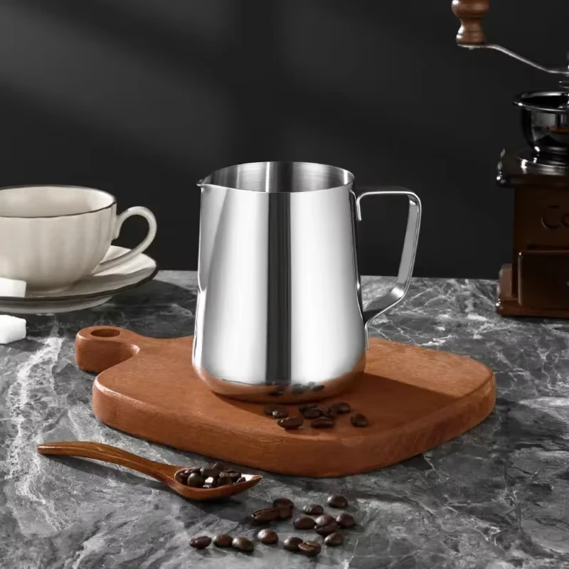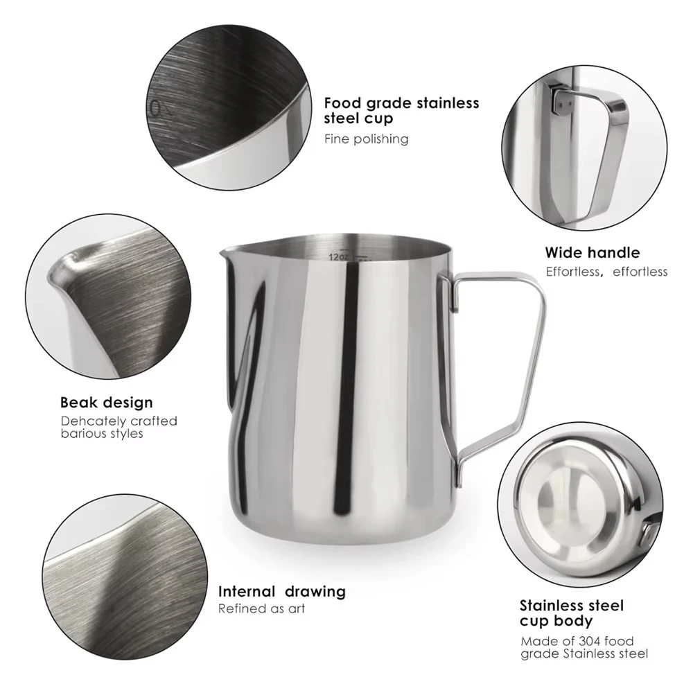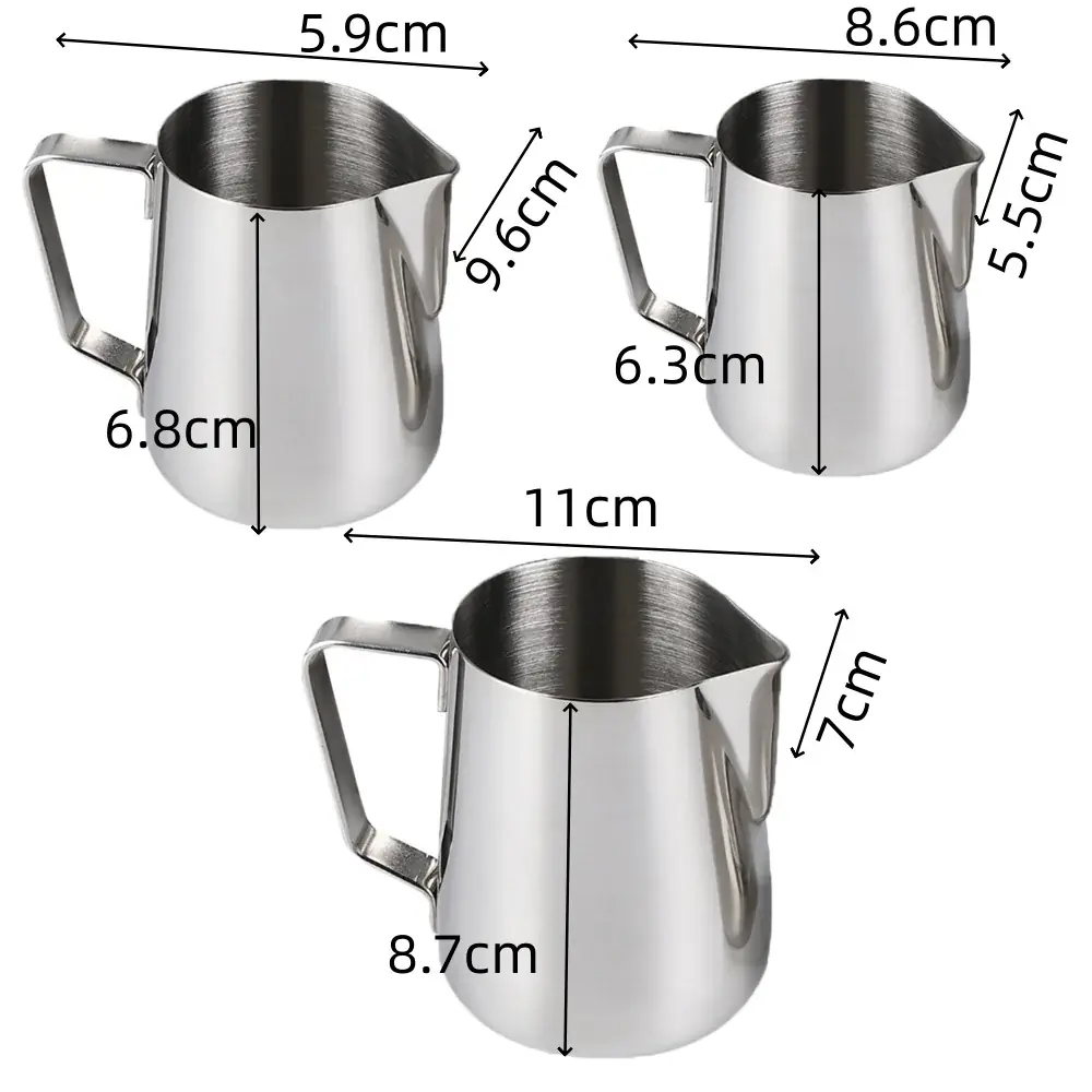اصنع فن اللاتيه بكل احترافية مع أباريق الحليب من الفولاذ المقاوم للصدأ من متجر سرح بسعات 150، 200، و350 مل. مثالية لسحب الزهور في القهوة وتحضير رغوة الحليب بسهولة.