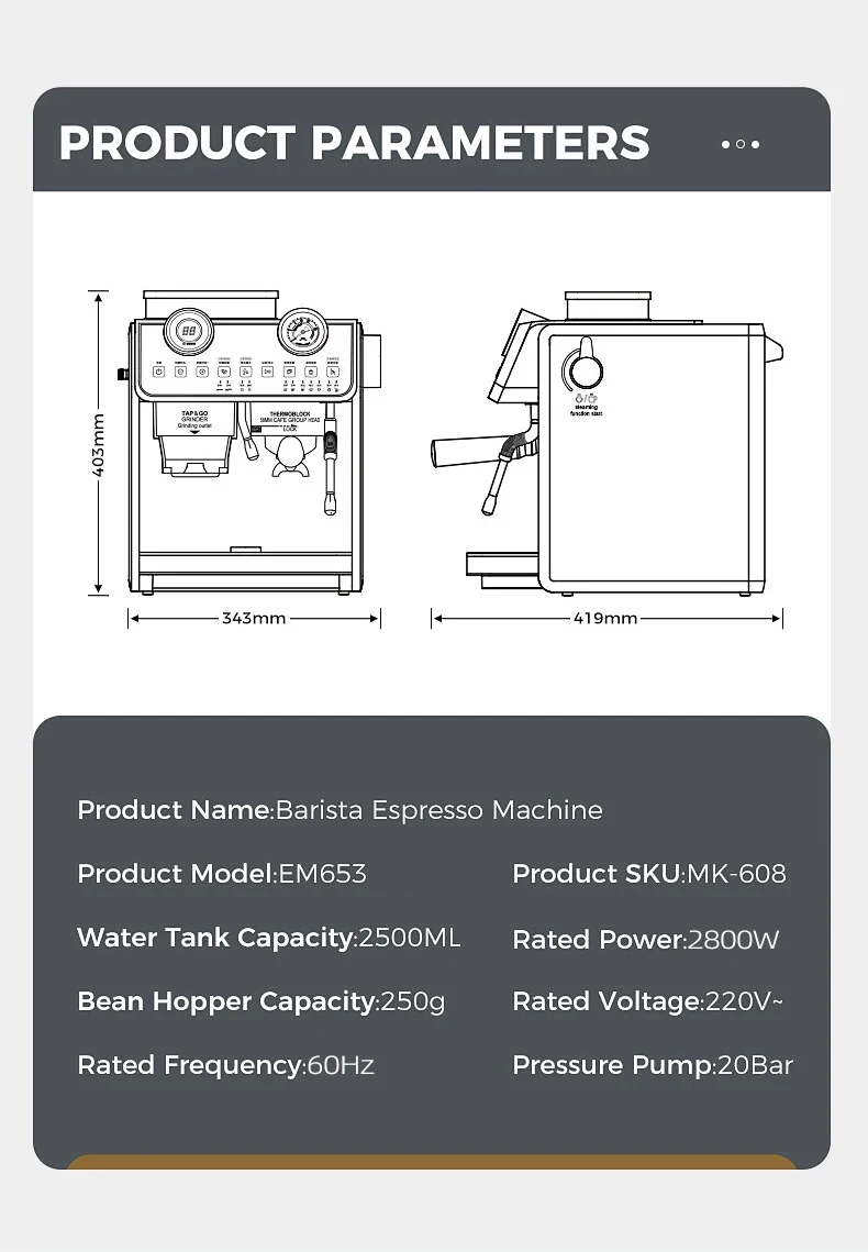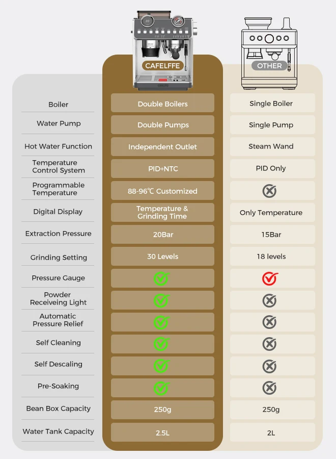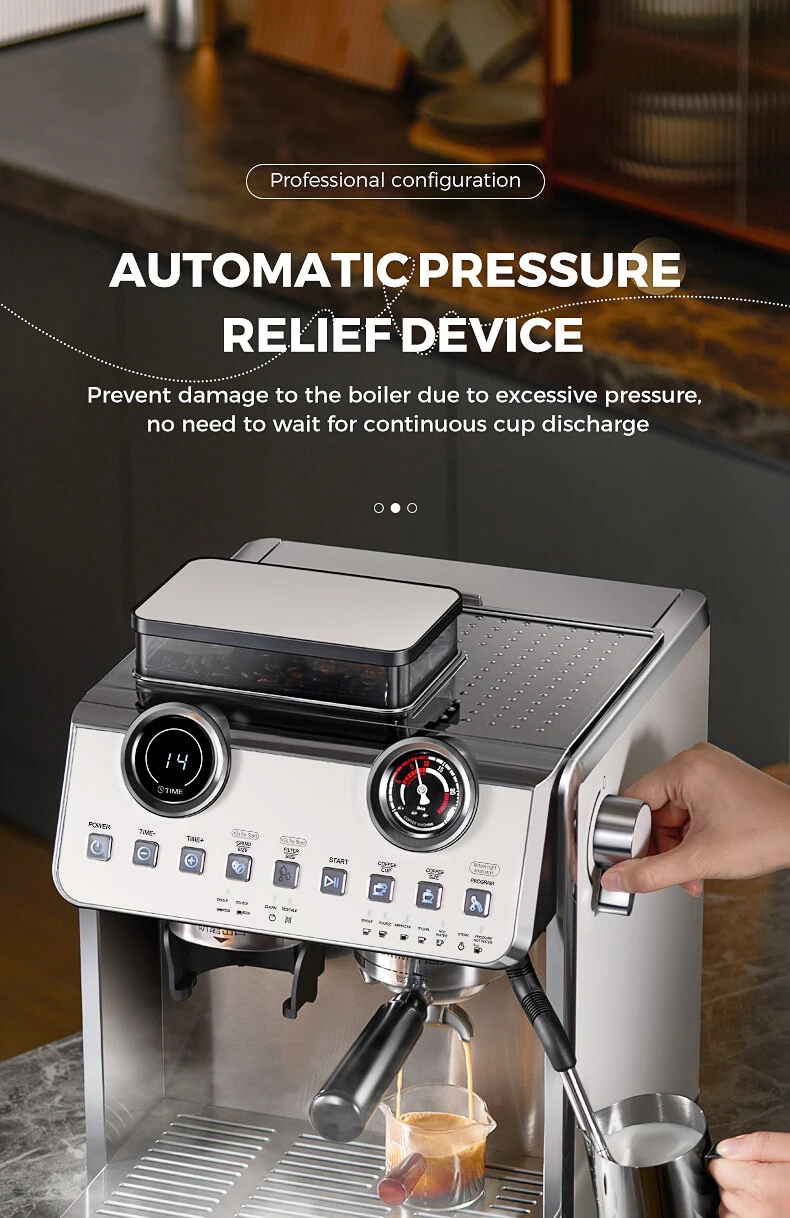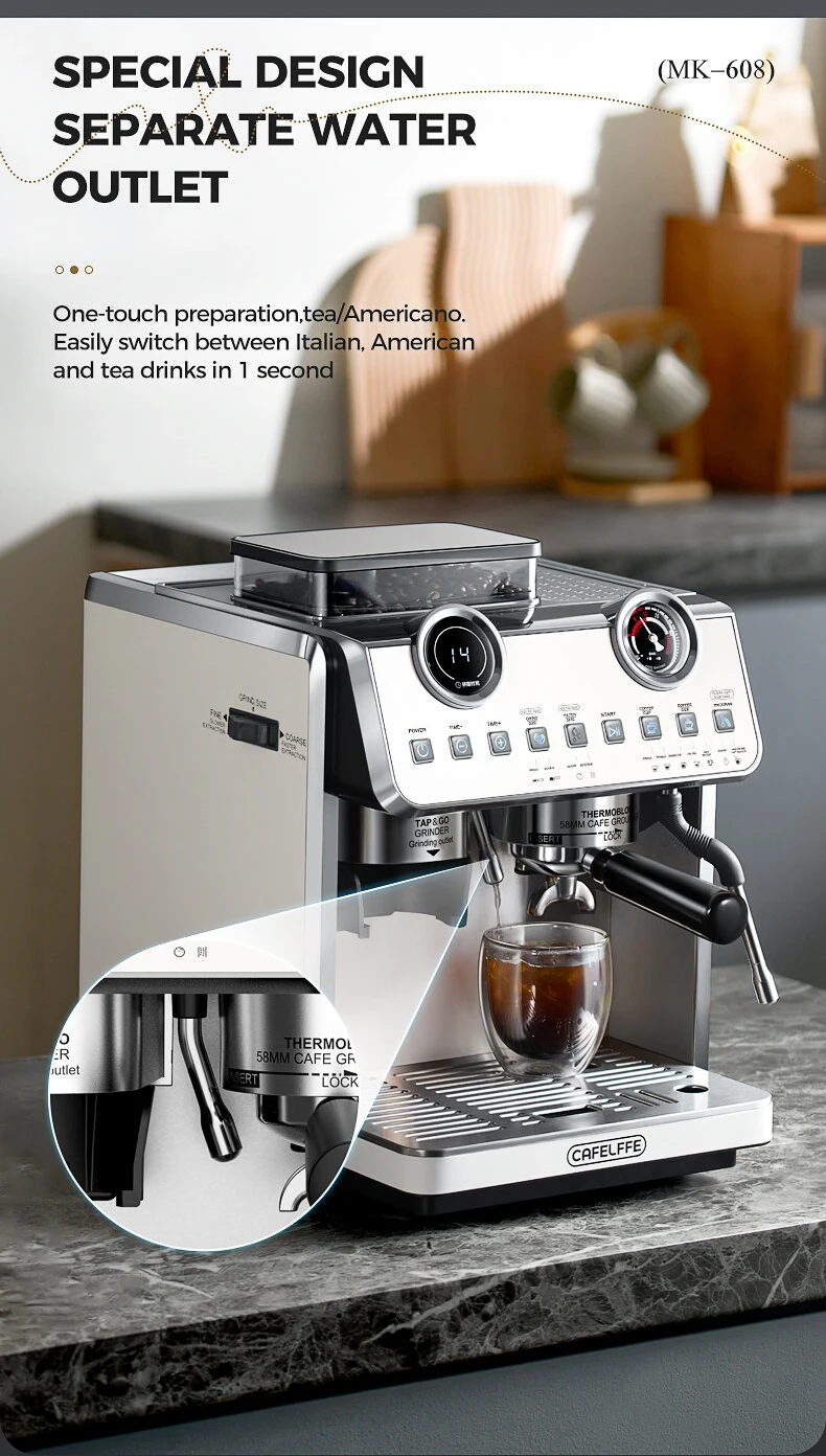 استمتع بتحضير إسبرسو احترافي مع Cafelffe Barista Pro من متجر سرح. ماكينة بضغط 20 بار، نظام المرجل المزدوج، إعداد قهوة من الحبوب مباشرة، مع خاصية التنظيف الذاتي وتحضير أمريكانو بضغطة واحدة.
