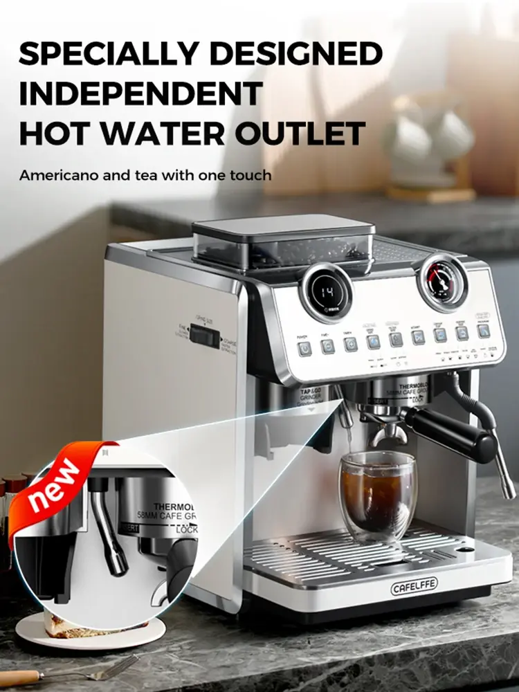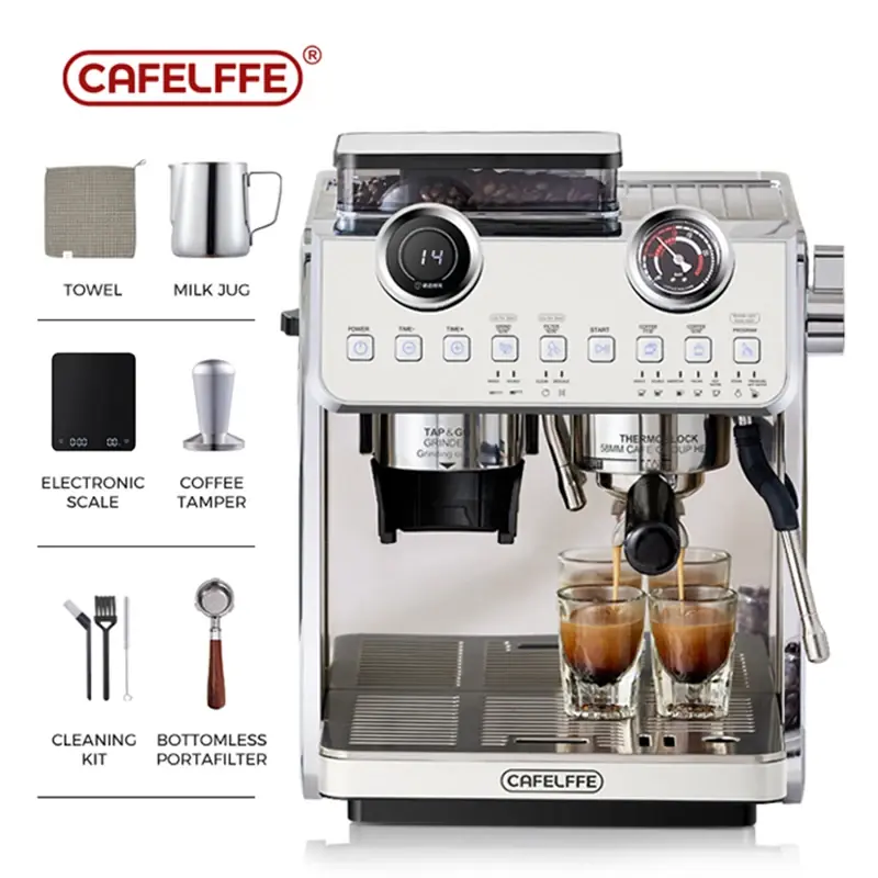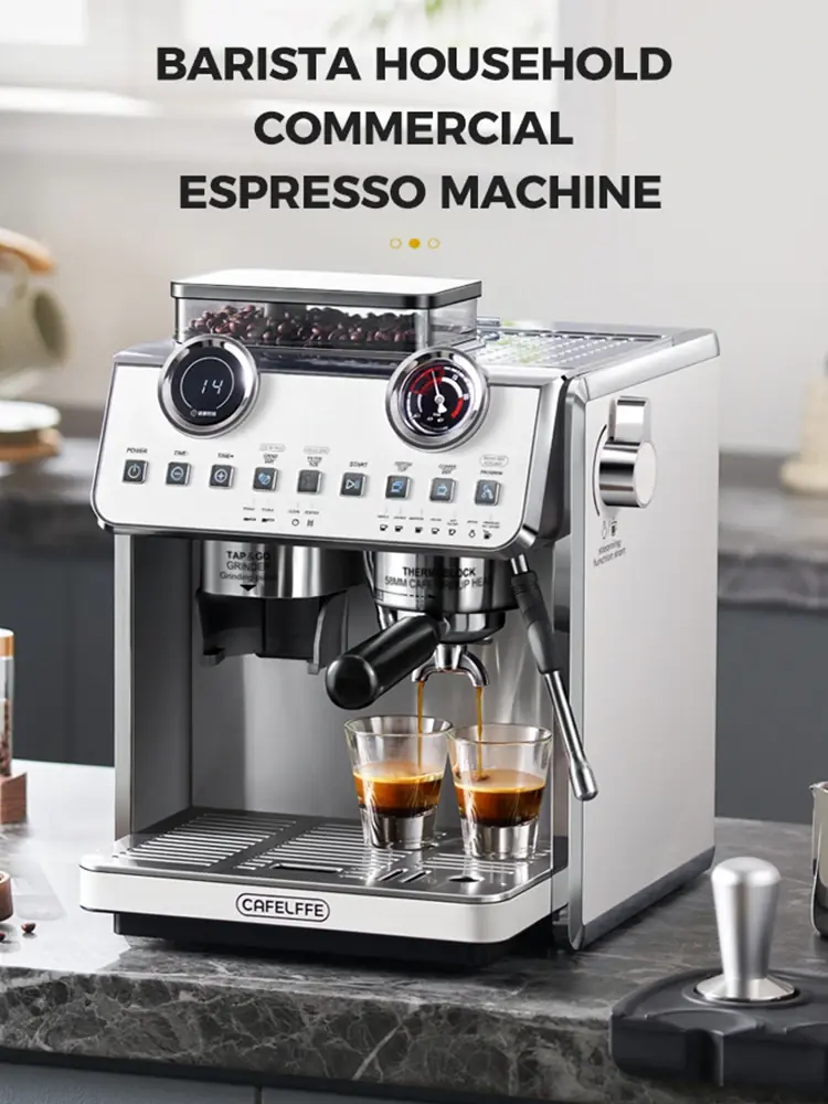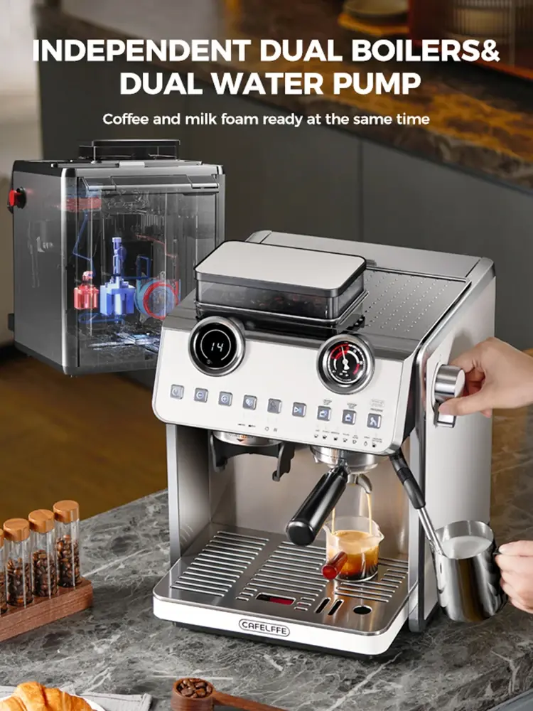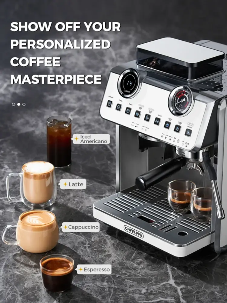 استمتع بتحضير إسبرسو احترافي مع Cafelffe Barista Pro من متجر سرح. ماكينة بضغط 20 بار، نظام المرجل المزدوج، إعداد قهوة من الحبوب مباشرة، مع خاصية التنظيف الذاتي وتحضير أمريكانو بضغطة واحدة.