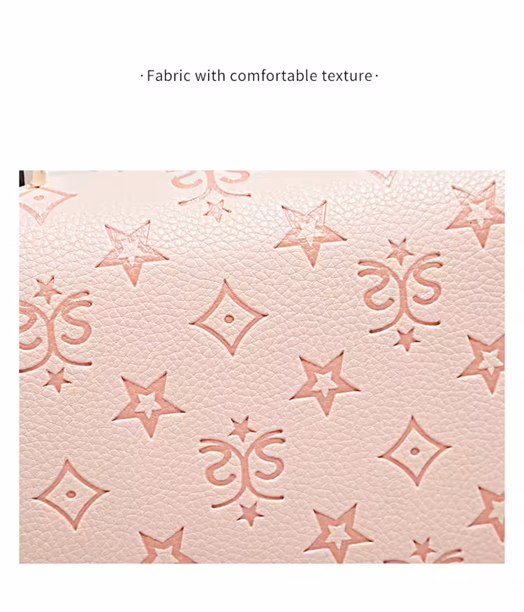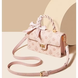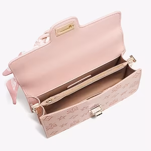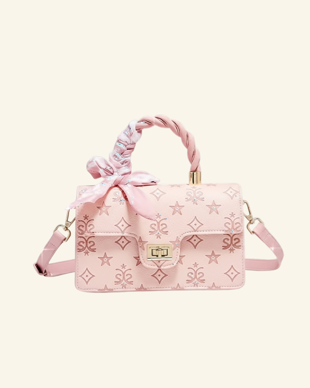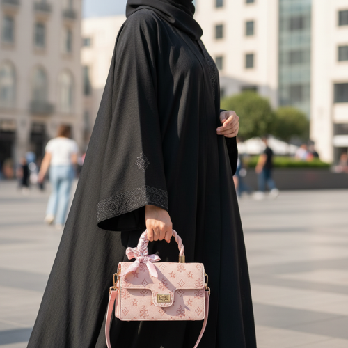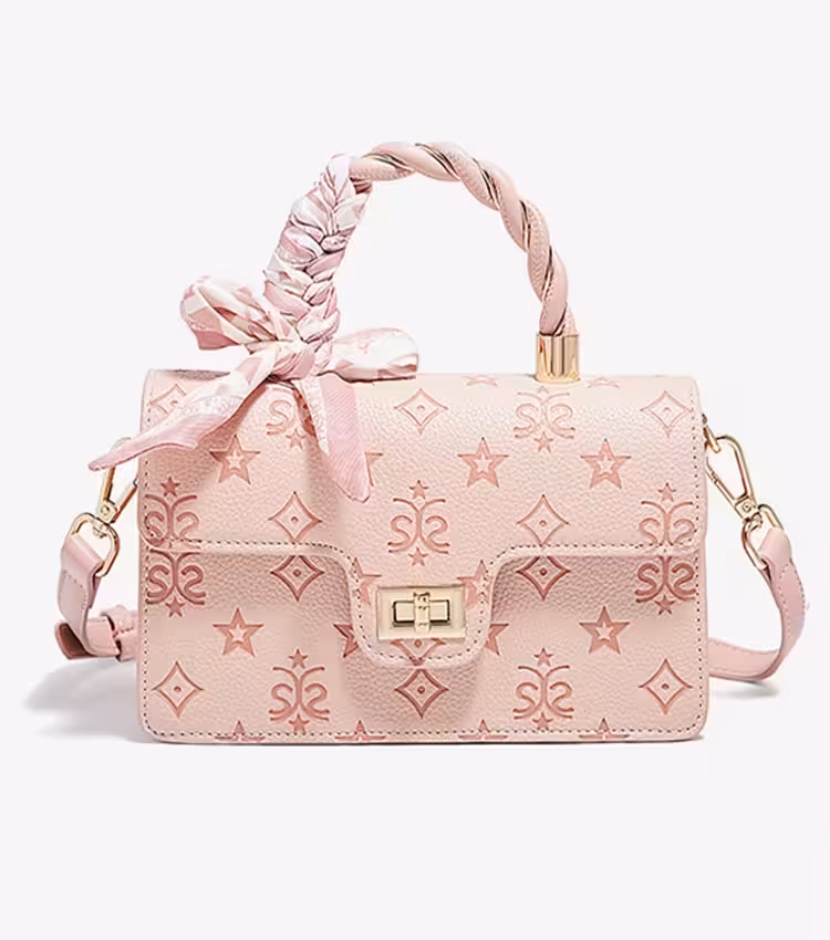 • اللون: وردي طافٍ مستوحى من الورد الطائفي، يمنح الحقيبة أنوثة ناعمة ورقي يناسب جميع المناسبات. • النقوش: نقوش بارزة هندسية وزهرية، تضيف بعدًا فنيًا يوحي بالفخامة والتميز. • الشكل: تصميم مستطيل منظم بخطوط متوازنة، يمنحها طابعًا عصريًا أنيقًا وسهل التنسيق. • المقبض: مقبض مضفور بجديلة ناعمة تحاكي الضفائر التراثية السعودية، يضيف تميزًا فريدًا. • الربطة: ربطة حريرية وردية على المقبض تمنح الحقيبة لمسة مرحة وراقية. • القفل: قفل معدني ذهبي أنيق يحافظ على مقتنياتك بأمان ويضيف لمسة فاخرة. • الحزام: حزام إضافي طويل قابل للتعديل والفصل، يتيح حملها باليد، على الكتف، أو ككروس بودي.