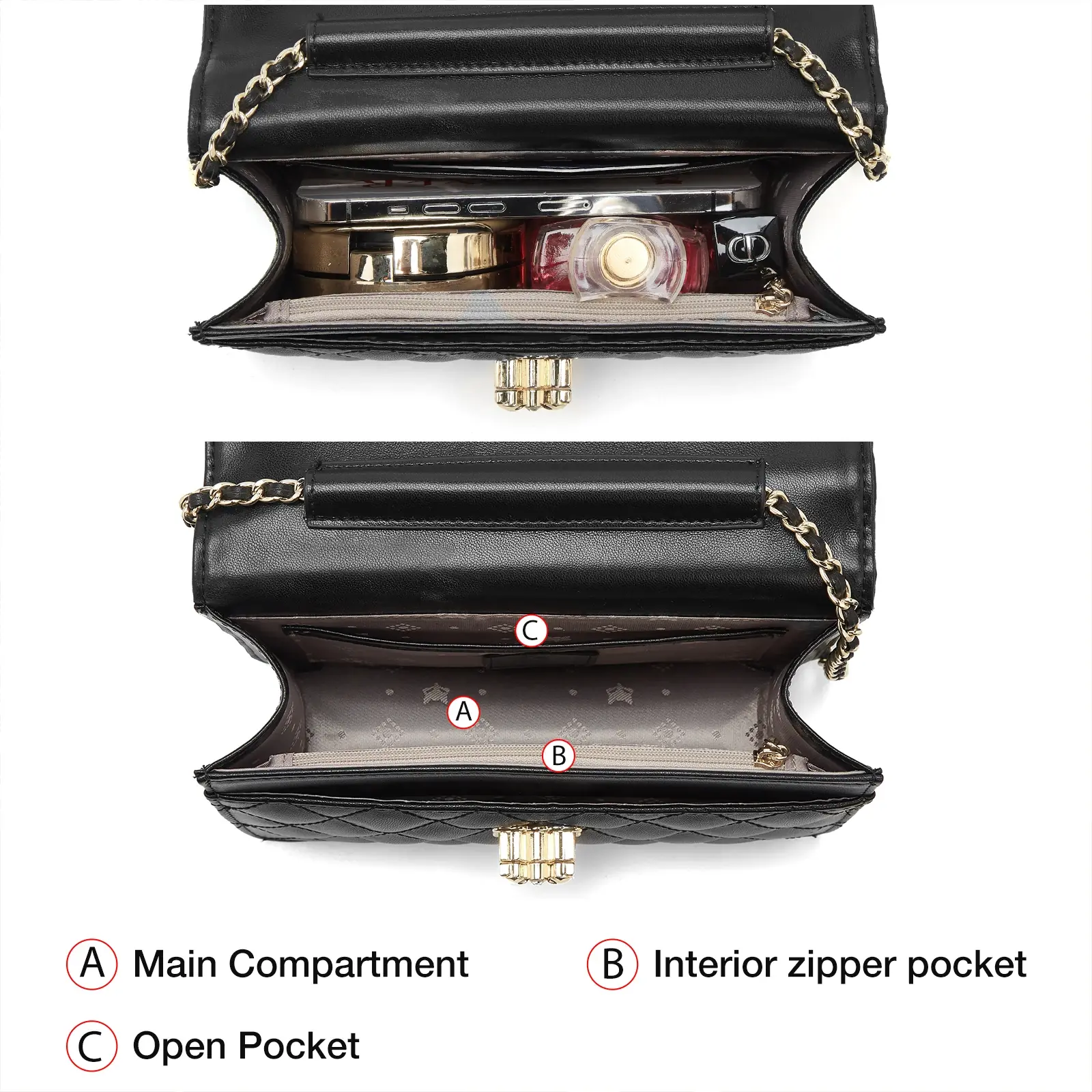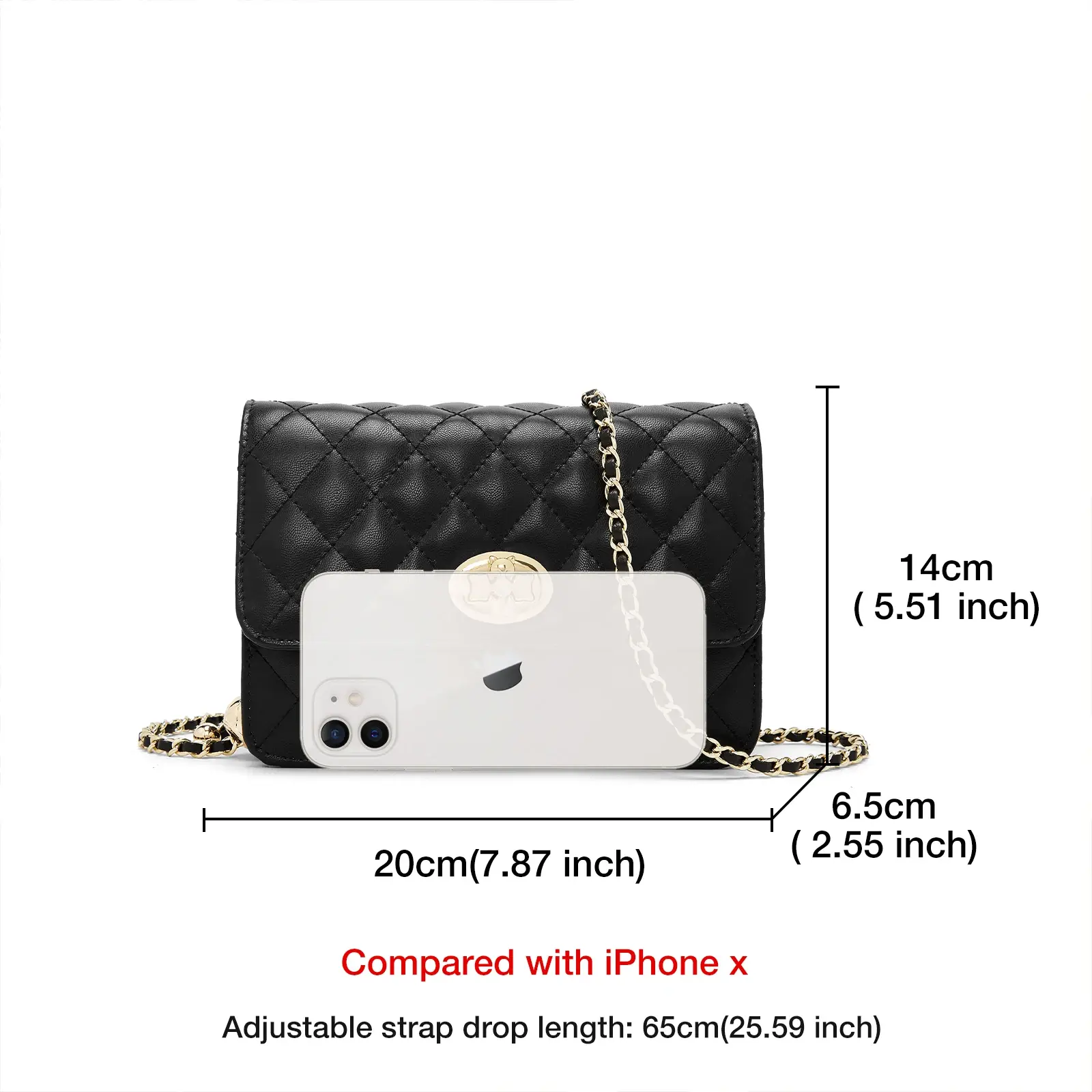 تأتي الشنطة بسلسلة معدنية أنيقة تمنحها مظهرًا فاخرًا، ويمكن ارتداؤها ككتف أو كروس بكل راحة. حجمها الصغير مناسب للمشاوير، المقاهي، المناسبات، أو كهديّة مميزة للزوجة أو الحبيبة.