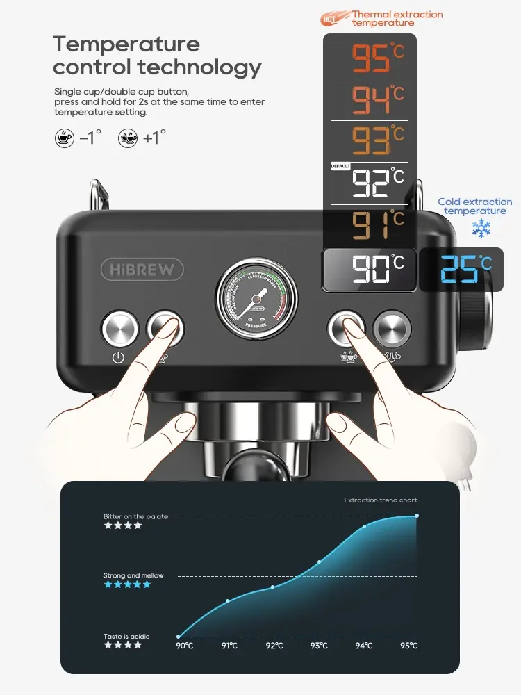قابلة لضبط درجة الحرارة والحجم: تحكم كامل للحصول على قهوة حسب رغبتك.