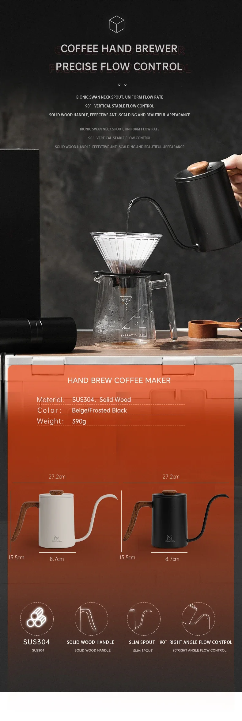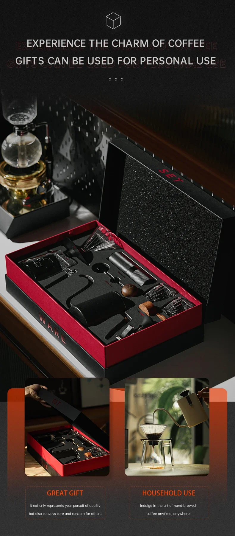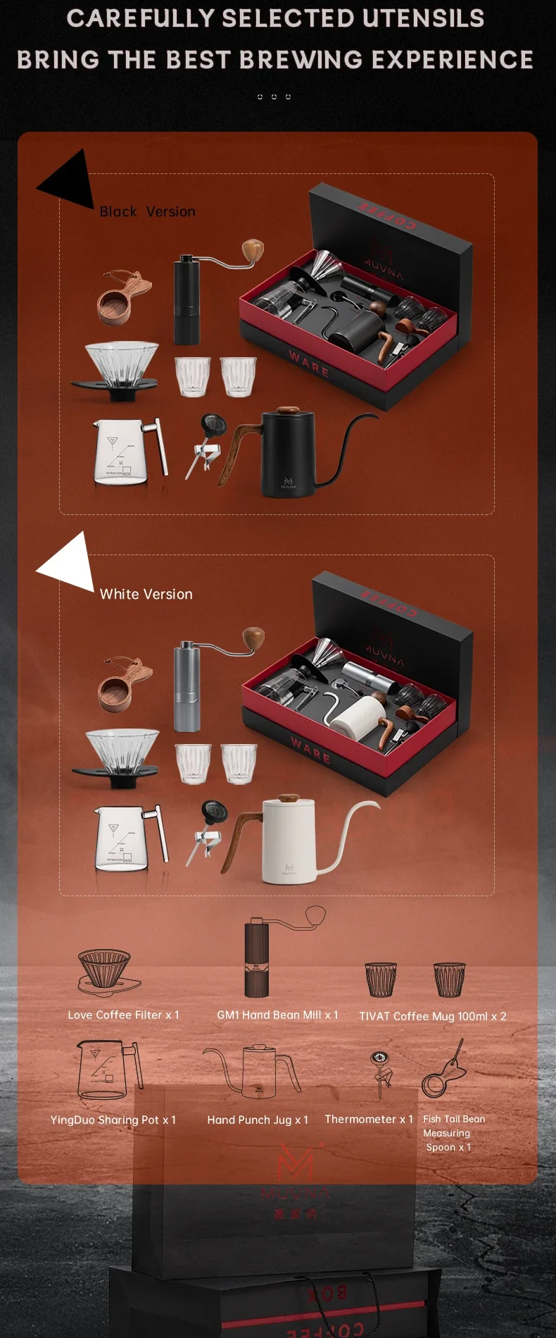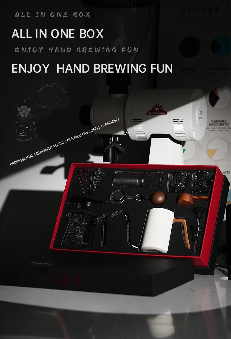 طقم شامل Eight-piece Kit: يحتوي على كأسين للشرب، مطحنة يدوية قابلة للتعديل، إبريق ماء رقبي، فلتر للقهوة، حامل Pour Over، ميزان رقمي دقيق، ومغرفة قياس الحبوب.