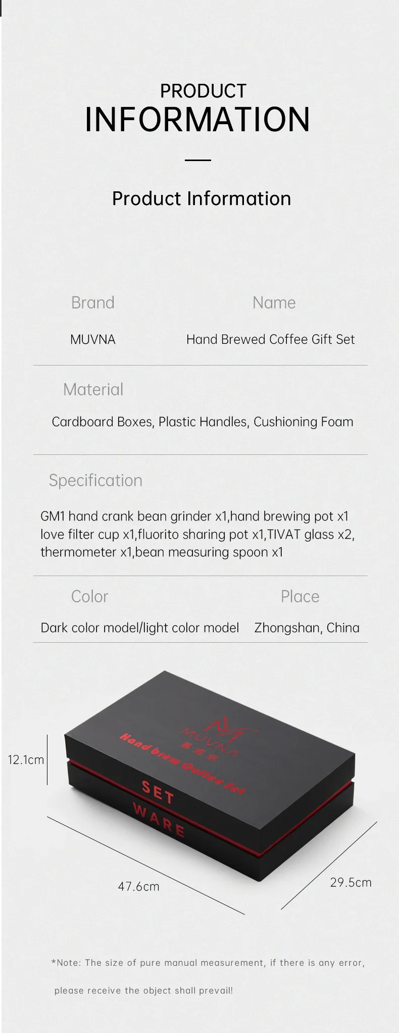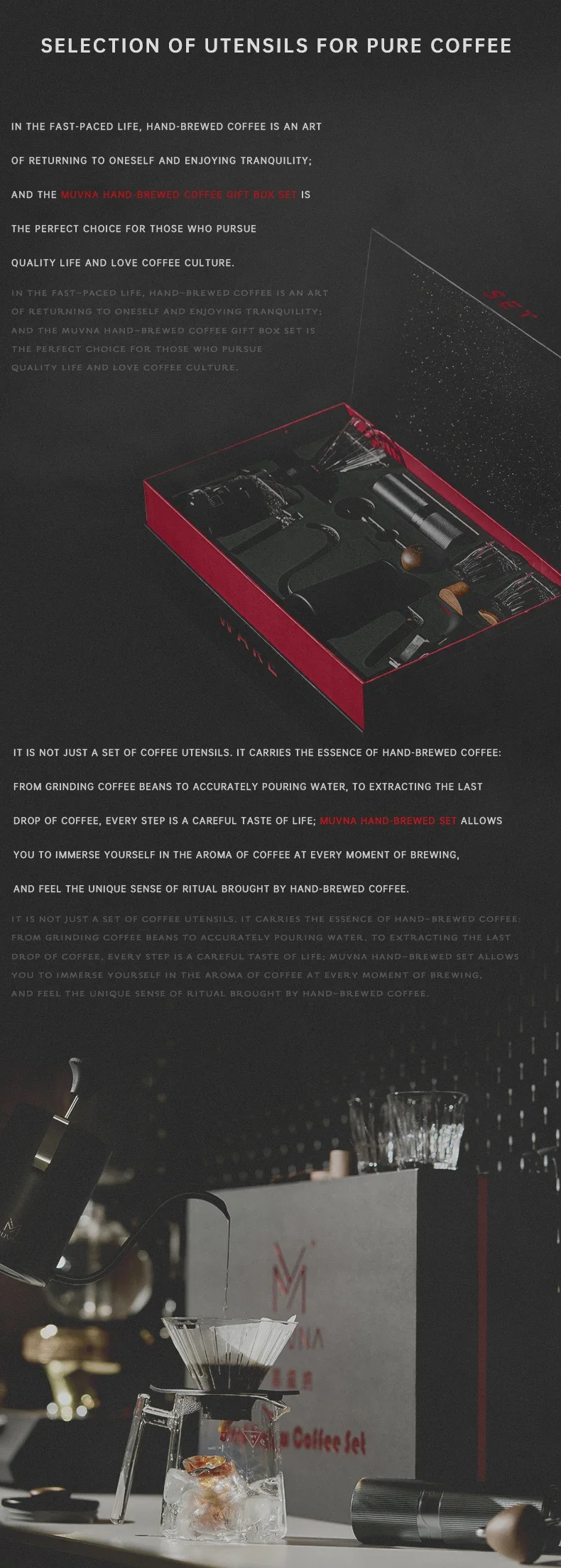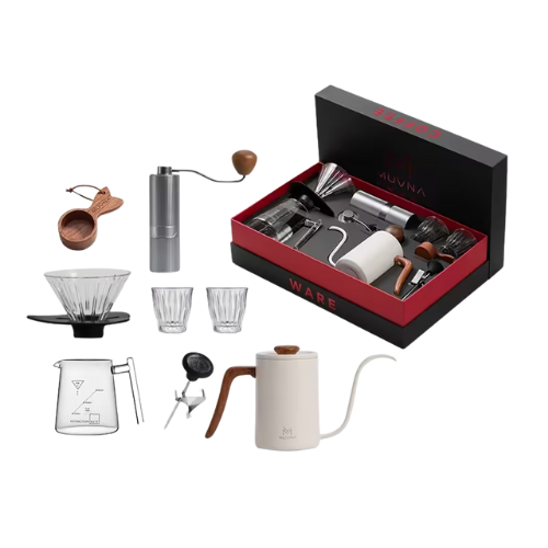 استمتع بتجربة قهوة احترافية في أي مكان مع طقم تحضير القهوة MUVNA من متجر سرح. يتضمن مطحنة يدوية، إبريق ماء رقبي، فلتر Pour Over، كأسين للشرب، ميزان رقمي، ومغرفة قياس الحبوب. مثالي للمنزل أو التخييم كهدية لعشاق القهوة.